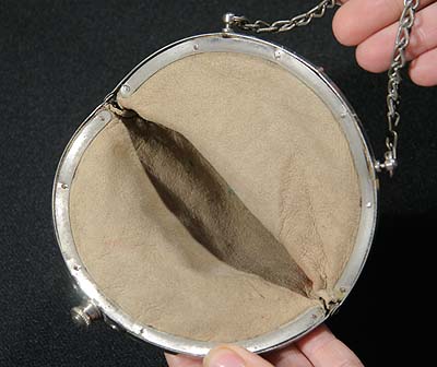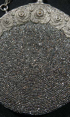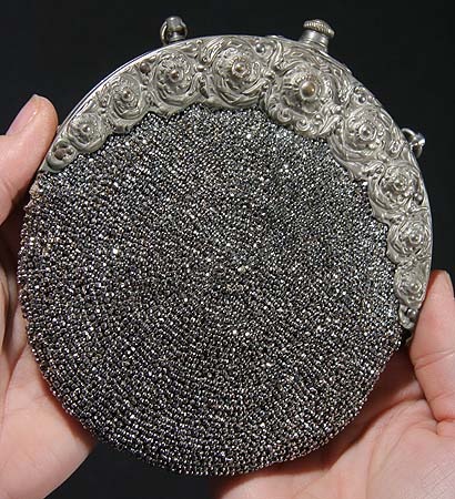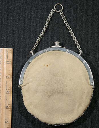 A pleasing round shape! This is a somewhat common and popular design from 1870-1880’s, a response to the earlier styles of beaded bags which came before this era, which had every color of the rainbow in them. Like the earlier purses, it also goes with everything--but with simple and rich silver-only versatility! However, when you find these, they are nearly always rusted, as the steel beads got wet somewhere along the timeline over the century plus twenty-five years of their lifetime! NOT THIS ONE! It is MINT, MINT, MINT condition. Not a speck of rust! No beads missing. The back of the purse has chamois leather, because it was meant to hang from a waist hook and would therefore rub against the wearer’s flowing skirt. The back was never beaded, so it did not have to withstand the wear of rubbing. The chamois leather is soft and pliable, which is also another sign of great care given this bag--most of this type are found hard and stiff. The frame design is a pleasing high-relief Victorian floral with curliques pattern. Inside the bag is chamois and soft, clean. You can use this purse, or it will beautify your wall and set off other items, such as pictures and prints. A honey and hard-to-find in such pristine condition, especially considering its great age. 5 inches in diameter.